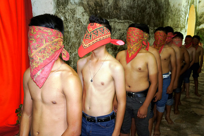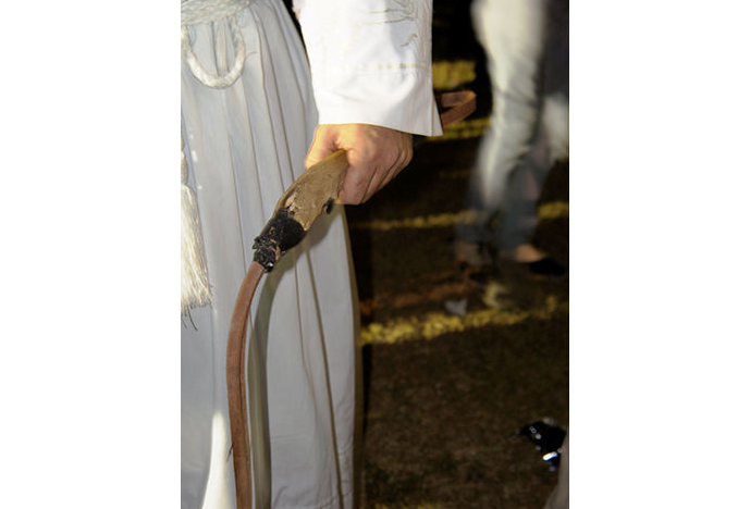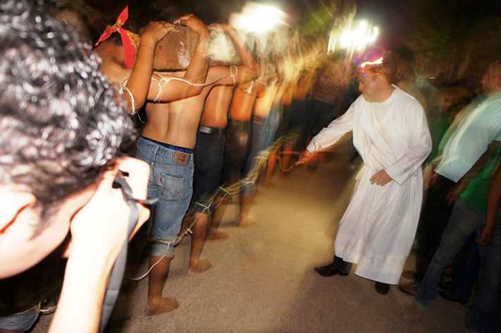 Don Ermilo Gómez es el líder de los Interesados. Su hijo Elvis Arturo lo ayuda a amarrar la soga. Él será el encargado de preservar la tradición cuando su papá ya no esté. Uriel, el nieto de don Ermilo, es apóstol en el grupo de la cruz pequeña. “Yo también fui apóstol. Me enorgullece poder conservar el patrimonio de mi pueblo y me agrada que los jóvenes quieran participar en esta fiesta”. Como don Ermilo, todos los voluntarios que esta noche se convierten en apóstoles o que colaboran de manera desinteresada en la conmemoración de la muerte de Jesucristo sienten un gran orgullo por sus raíces. Este es también el caso de José Jesús Jiménez Vázquez que, con 20 años, representa por primera vez el papel de apóstol junto a otros amigos y conocidos. Su hermana, Samantha, tiene claro porque José Jesús quiso ser apóstol: “Esto no se hace por tradición. Se hace porque Dios te llama, porque hay fe y vocación.”. Samantha, que no tiene más de veinte años, es catequista y tiene un fuerte compromiso con la Iglesia y con la difusión de la palabra de Dios. Ha participado activamente en los preparativos de esta Semana Mayor y cada sábado se reúne con jóvenes de Maní, normalmente en el convento, para acercar el mensaje de Jesucristo a las nuevas generaciones. “Los jóvenes cada vez se alejan más de la religión. Es importante que nos acerquemos a Dios porque de esta manera ahuyentaremos los vicios de la vida vaga. Cerca de Dios todo es perfecto”. La importancia del relevo generacional en las manifestaciones patrimoniales y religiosas es, esta noche, una evidencia compartida con agrado por todos los asistentes. “Nosotros, los jóvenes, debemos preservar las raíces culturales de Maní”. Los apóstoles, como los catequistas, difundieron la palabra de Dios. A la pregunta de si a ella le hubiera gustado ser apóstol, como mujer, sonríe y declara que nunca se lo había planteado. “Ya está todo escrito. Solamente Jesucristo sabe porque eligió hombres como apóstoles”.